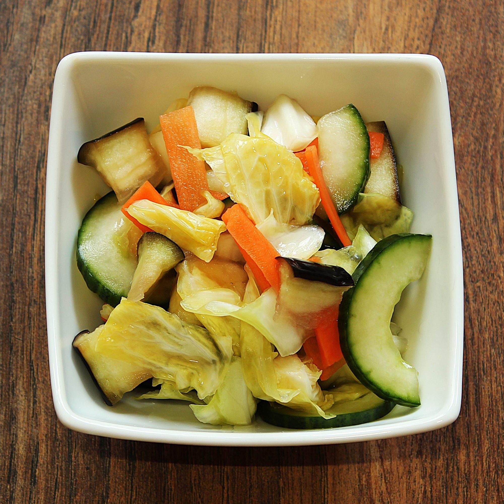 Home made lightly pickled vegetable salad with Aubergine, Carrot, Cabbage and Cucumber and red chili. Savoury and refreshing. This is something you will see in every supermarket in Japan.